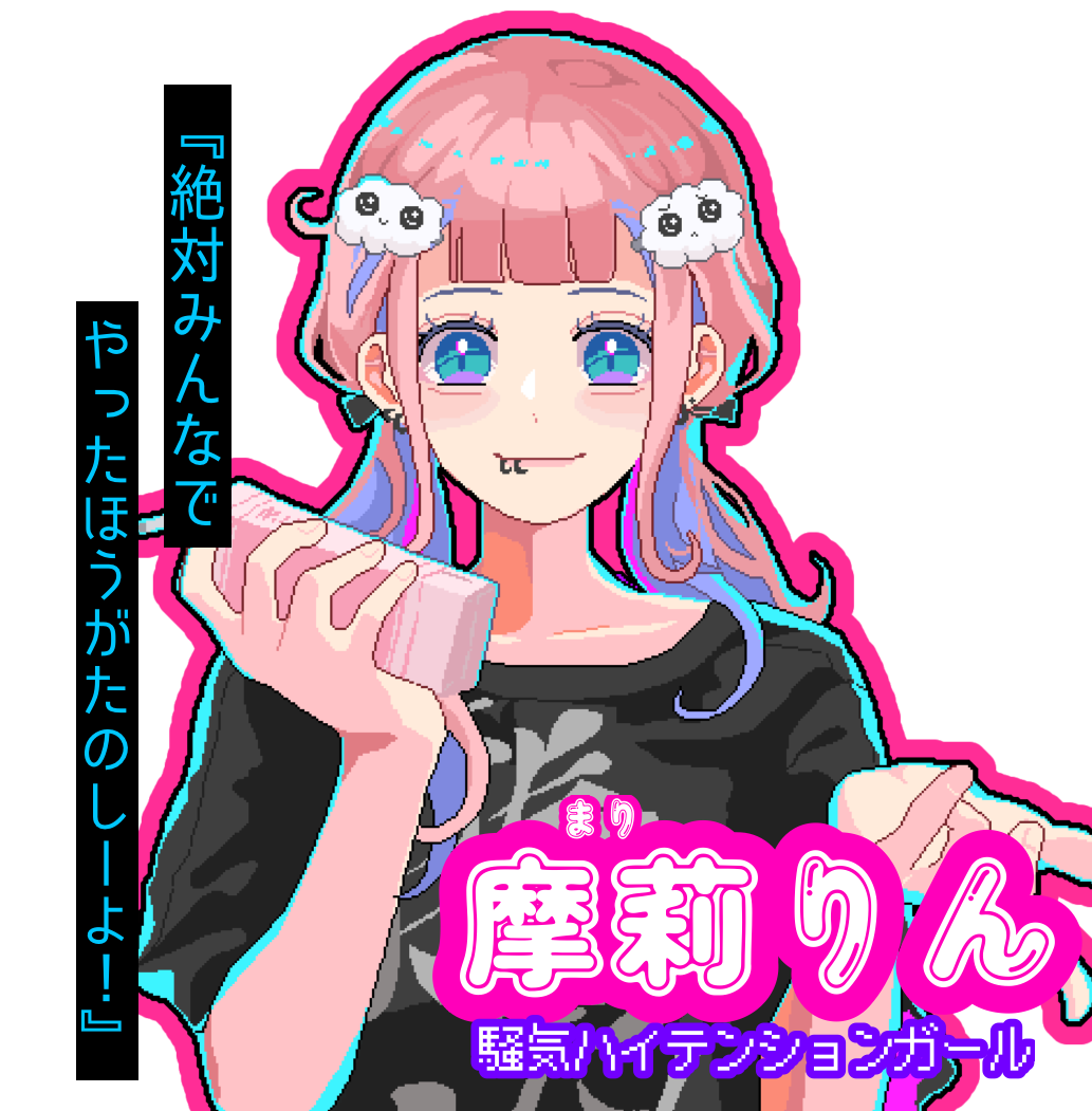 ネタTシャツを着たハイテンションな界隈女子。常に落ち着きがなく、よく会話が飛ぶ。 konちゃとは腐れ縁で兄妹か漫才コンビのように仲がいい。